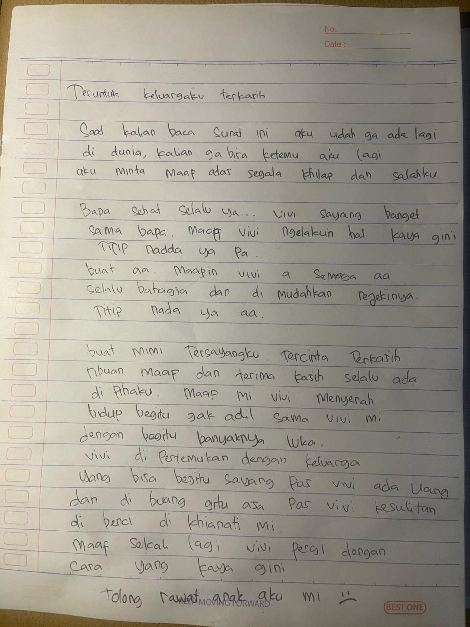 Peristiwa memilukan itu semakin menyayat ketika petugas menemukan dua lembar surat tulisan tangan di dalam kamar. Surat yang diduga sebagai pesan terakhir korban itu berisi permohonan maaf kepada keluarga serta ungkapan beban emosional yang selama ini dipendamnya. Tulisan korban tampak bergetar, penuh goresan perasaan tertekan dan luka mendalam yang dialaminya.